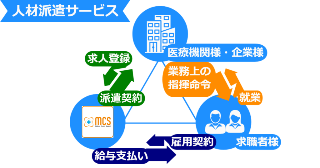 人材派遣サービスとは、派遣先となる求人様の事業所へ求職者様を弊社より派遣して、かつ派遣先ご担当者の指揮命令のもとで派遣労働を提供する雇用形態のことです。